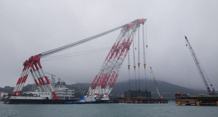 為該項目的主承建方——中鐵大橋局量身打造的3600噸浮式起重機,由青島海西重機自主研發(fā)、設(shè)計、制造、安裝和調(diào)試,采用變幅式雙臂架結(jié)構(gòu),其起重重量為3600噸,最高起升高度110米,不僅減小了橋梁吊裝吊具結(jié)構(gòu),而且提高了橋梁吊裝的有效高度,極大地滿足了橋梁吊裝施工的要求,經(jīng)受住了現(xiàn)場惡劣海況的考驗,成為大橋建設(shè)“左膀右臂”,被用戶親切地稱為“海上建橋神器”。