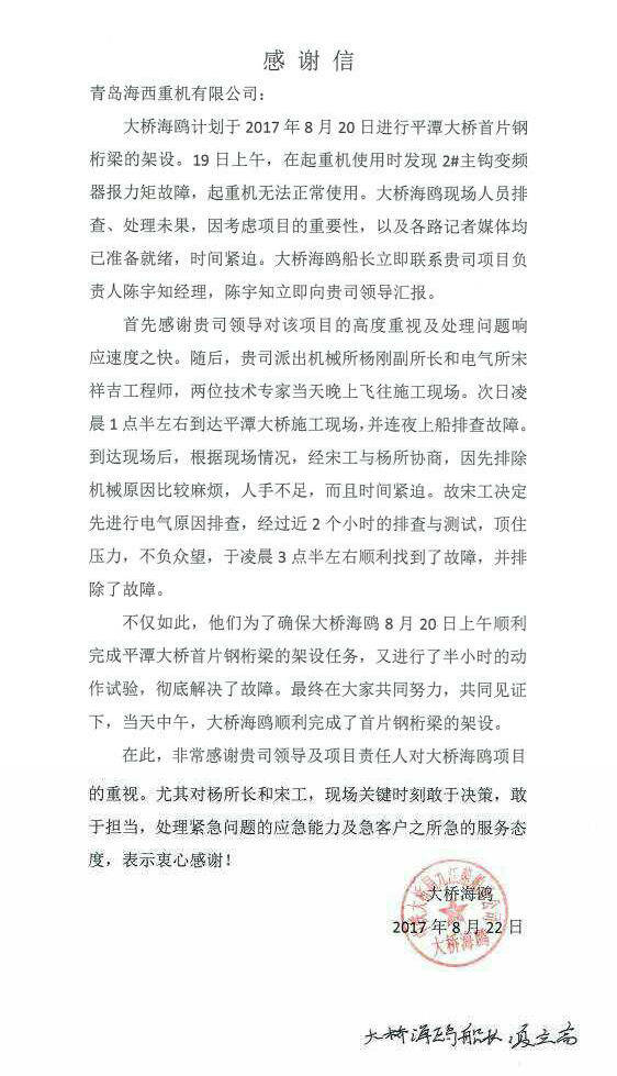 自今年年初設備交付以來,海西重機定期安排技術人員進行回訪,協(xié)助業(yè)主方對設備進行檢查和保養(yǎng),及時處理故障,保證設備高效運作,有力地保障了現(xiàn)場施工的可靠性和穩(wěn)定性,海西重機工作人員負責、用心的工作態(tài)度和完善的售后服務得到了業(yè)主方的一致好評,業(yè)主特發(fā)來感謝信給予表揚。
