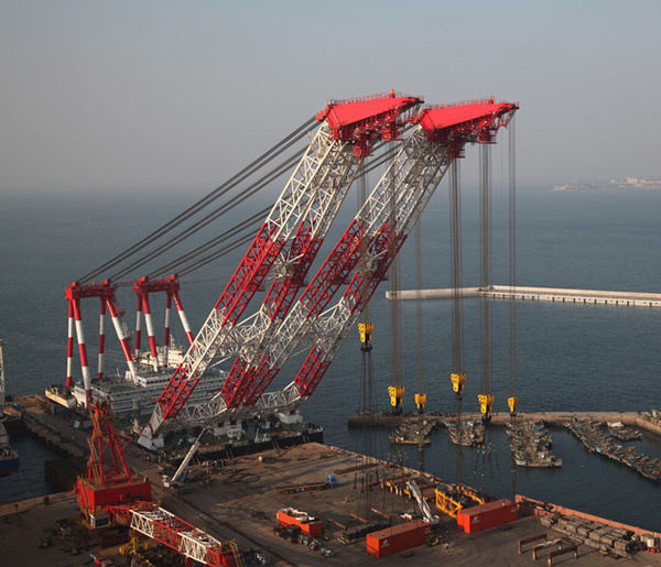 就是這個正在大顯身手的“大橋海鷗號”起重船,是由青島海西重機聯(lián)手武船集團為中鐵大橋局量身打造的。3600噸浮式起重機作為起重船核心技術之一,由青島海西重機自主研發(fā)、設計、制造、安裝和調(diào)試,采用變幅式雙臂架結構,其起重重量為3600噸,最高起升高度110米,不僅減小了橋梁吊裝吊具結構,而且提高了橋梁吊裝的有效高度,能更好地滿足橋梁吊裝施工的要求,且經(jīng)受住了施工海域風大、浪高、水深、流急等惡劣海況的考驗,成為大橋建設“左膀右臂”,被用戶親切地稱為“海上建橋神器”。