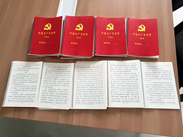 活動開展以來,海西重機(jī)黨委委員率先垂范,帶頭抄寫黨章,逐字逐句學(xué)習(xí)黨章,各黨支部書記紛紛響應(yīng),全體黨員積極認(rèn)真開展抄寫黨章和學(xué)習(xí)黨章,本次活動取得圓滿的效果,海西重機(jī)掀起抄黨章學(xué)黨章的熱潮,營造了“把加強(qiáng)學(xué)習(xí)作為第一需要”良好學(xué)習(xí)氛圍。通過本次逐字逐句學(xué)黨章活動不僅加深了對黨員身份的認(rèn)識,重新認(rèn)真溫習(xí)黨章、感悟黨章精神實質(zhì),激發(fā)黨員干部干事創(chuàng)業(yè)的熱情,充分發(fā)揮黨員真學(xué),真用,真抓,真干的表率作用。