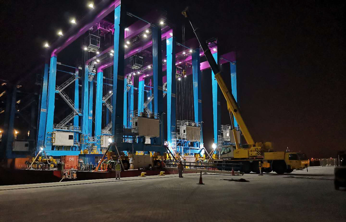 而在7月末發(fā)運(yùn)的第一批12臺40T輪胎吊經(jīng)過1個月的航行到港后,9月初順利完成卸船,擁入新哈馬德港的懷抱。由于業(yè)主方的高層對該項(xiàng)目高度重視,碼頭方有關(guān)人員還在碼頭舉行儀式迎接設(shè)備抵港并全程航拍錄像。因項(xiàng)目整體施工策劃得當(dāng)、安全高效,疫情防控和設(shè)備調(diào)試并駕齊驅(qū)兩不誤,“海西重機(jī)”再一次贏得了業(yè)主的稱贊。