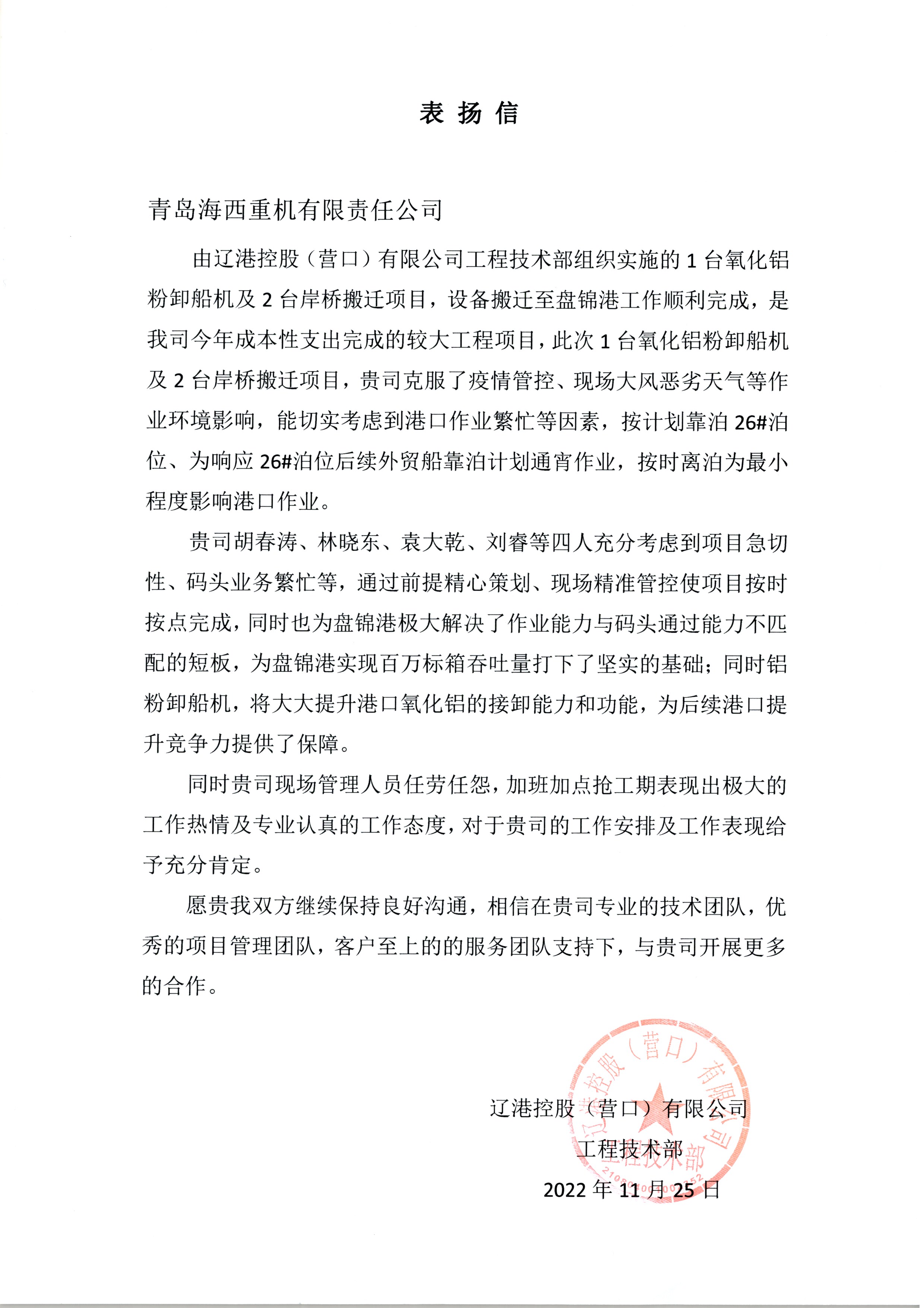 項目施工期間,正值當?shù)匾咔榉揽鼐o張之時,經(jīng)過溝通協(xié)調(diào),在遼港控股、盤錦港集團的大力支持下,特批了綠色通道,提供港內(nèi)食宿。項目攻關(guān)小組所有人員均食宿在碼頭,克服大風、寒潮等惡劣天氣以及疫情帶來的不利因素,經(jīng)過20多天的晝夜奮戰(zhàn),設(shè)備最終安全高效、保質(zhì)保量的交付客戶使用。專業(yè)的人干專業(yè)的事,整個項目搬遷工作得到了客戶的充分肯定和贊揚。