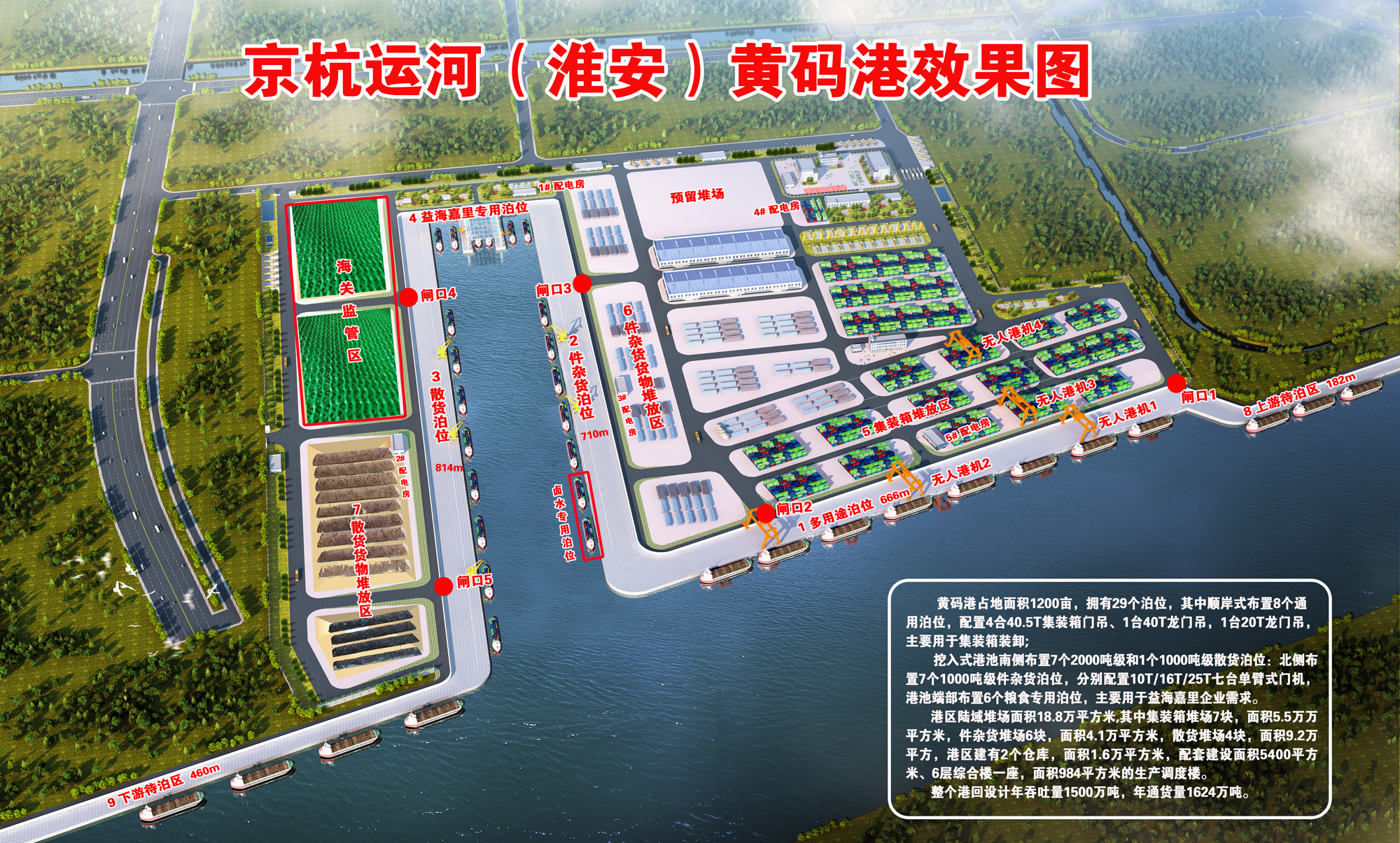 據(jù)了解,黃碼港位于京杭大運(yùn)河和淮河入海水道交匯處,處于京杭運(yùn)河蘇北段的中心,是通江達(dá)海、貫通南北的重要樞紐,是名副其實(shí)的“水上立交”。黃碼作業(yè)區(qū)項(xiàng)目規(guī)劃有29個(gè)千噸級(jí)裝卸泊位,可實(shí)現(xiàn)吞吐能力1650萬噸,是京杭運(yùn)河沿線單體投資最大、泊位最多的港口,建成后將成為京杭運(yùn)河主航道沿線重要的現(xiàn)代化內(nèi)河港口。