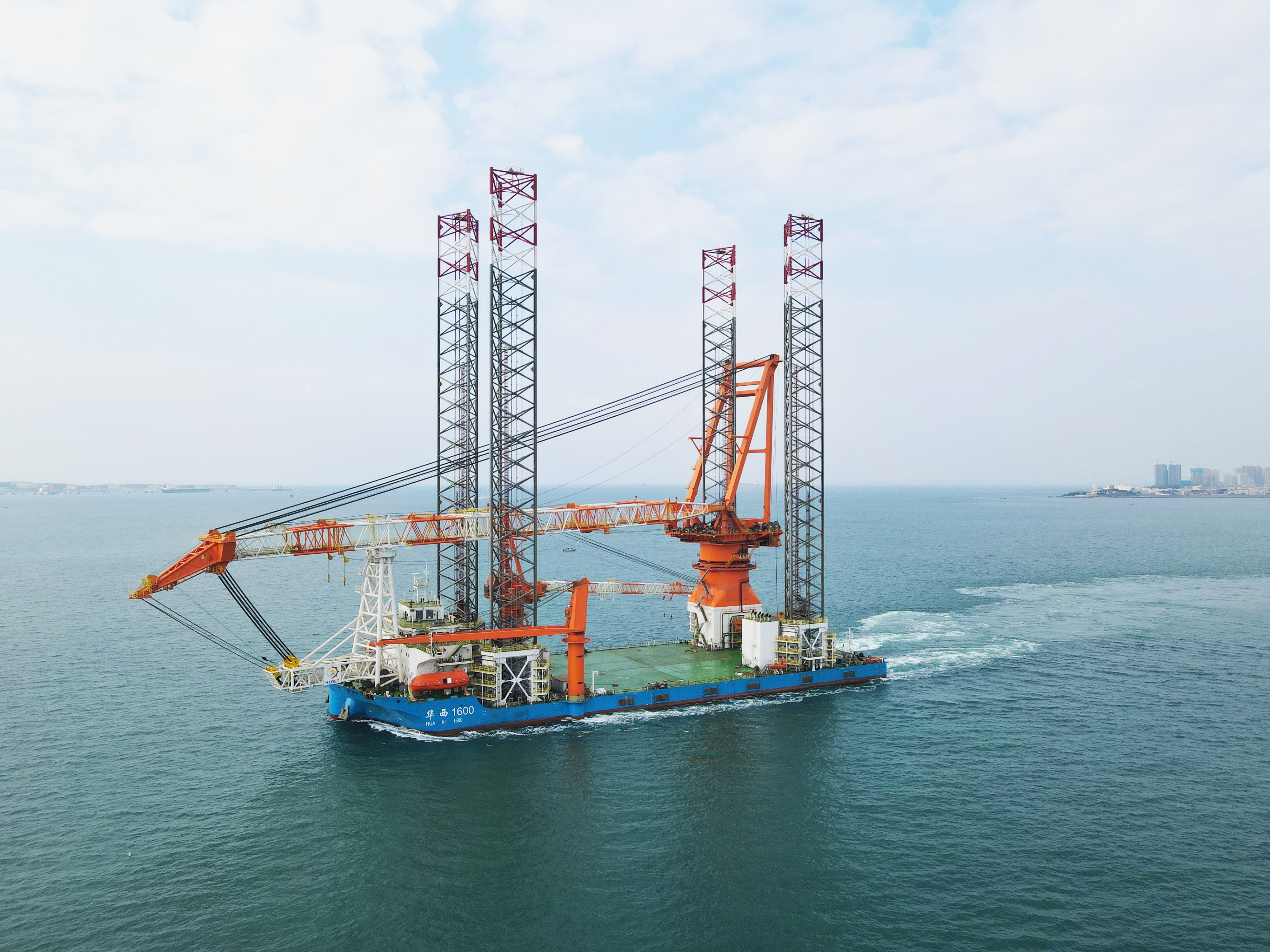 華西海工1600T風(fēng)電安裝平臺(tái)項(xiàng)目是武漢船機(jī)建造的最新一代風(fēng)電安裝平臺(tái),最大作業(yè)水深70米,主吊機(jī)起重能力1600噸,甲板作業(yè)面積相當(dāng)于11個(gè)籃球場(chǎng),是目前國(guó)內(nèi)作業(yè)水深最大、海上施工能力最強(qiáng)、功能最全、效率最高的桁架式樁腿風(fēng)電安裝平臺(tái)。