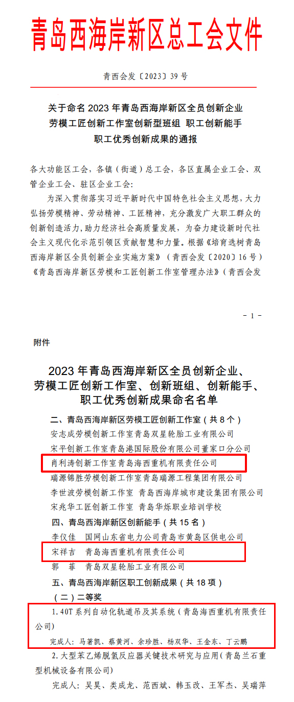 此次評(píng)選工作由青島西海岸新區(qū)總工會(huì)組織開(kāi)展,經(jīng)過(guò)海西重機(jī)基層工會(huì)推薦,資料申報(bào)、西海岸新區(qū)總工會(huì)資格審查、專家組評(píng)審,區(qū)總工會(huì)現(xiàn)場(chǎng)考察、會(huì)議研究及社會(huì)公示等環(huán)節(jié),最終“肖利濤創(chuàng)新工作室”榮獲西海岸新區(qū)“勞模工匠創(chuàng)新工作室”榮譽(yù)稱號(hào),位居同類第三;“40T系列自動(dòng)化軌道吊及其系統(tǒng)(完成人:馬著凱、蔡黃河、余珍勝、楊雙華、王金東、丁云鵬)”榮獲西海岸新區(qū)“職工創(chuàng)新成果”二等獎(jiǎng);宋祥吉同志脫穎而出,榮獲西海岸新區(qū)“職工創(chuàng)新能手”榮譽(yù)稱號(hào)。