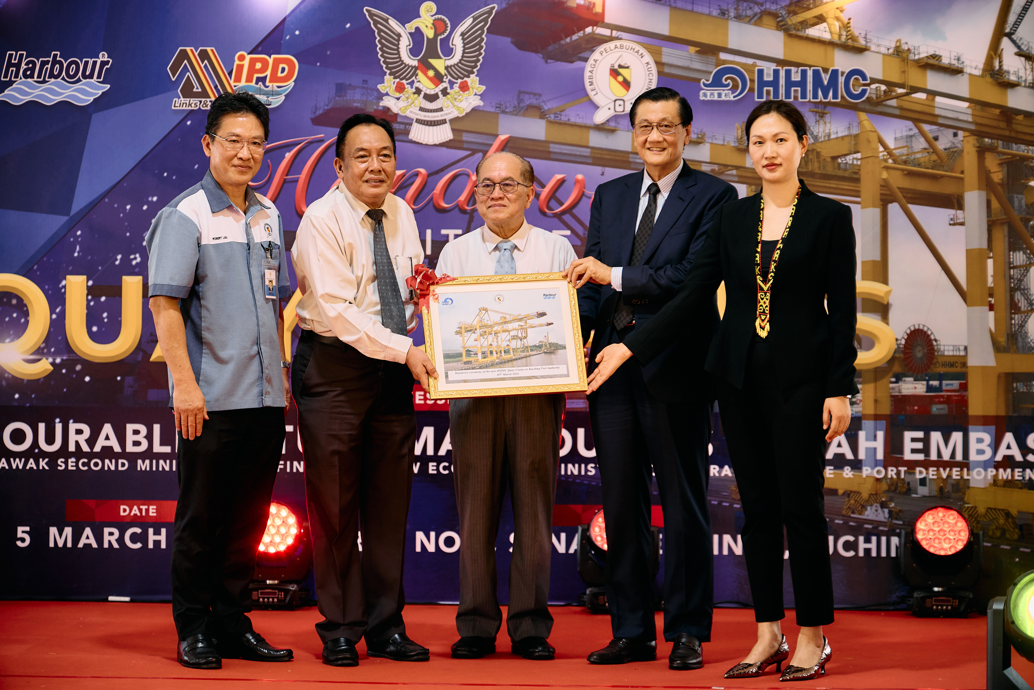 交機(jī)儀式上,馬來西亞砂拉越州副總理兼基礎(chǔ)建設(shè)與港口發(fā)展部部長Amar Douglas Uggah Embas、古晉港港務(wù)局主席Awang Bemee Bin Hj.Pengiran Ali Basah、Harbor Link集團(tuán)董事長Francis Yong Piaw Soon蒞臨現(xiàn)場并分別致辭,各方強(qiáng)調(diào)了該項目對當(dāng)?shù)馗劭诎l(fā)展的重要經(jīng)濟(jì)意義與社會意義,同時對海西重機(jī)產(chǎn)品以及項目團(tuán)隊給予了充分肯定。隨后,各方在岸橋前進(jìn)行剪彩并合影留念。