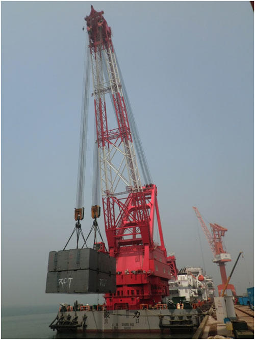700T浮吊是我司為上海打撈局制作的全回轉(zhuǎn)浮式起重機。該機總重約2600噸,由轉(zhuǎn)盤總成、機房總成、回轉(zhuǎn)支撐及圓筒總成、人字架總成、臂架總成等結(jié)構(gòu)構(gòu)成。其額定起吊重量為700T,最大變幅幅度為68M,主要用于超重大件的吊裝作業(yè),設備安裝作業(yè)及水上施工、打撈和救援作業(yè)。