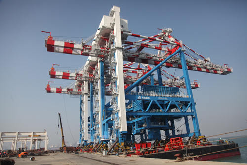 這次滾裝的三臺(tái)設(shè)備中,1500T/H卸船機(jī)是為華能(福建)海港公司研制的大型卸船機(jī)(共三臺(tái));兩臺(tái)MQ2535門機(jī)是為中國重要深水港口之一,西南部第一大港——廣西防城港生產(chǎn)的首批(共七臺(tái))門座起重機(jī)。這次三臺(tái)大型港機(jī)在同一天內(nèi)整機(jī)順利滾裝成功,再次驗(yàn)證了公司設(shè)計(jì)水平、制造工藝、組織能力和海綁捆扎工藝的成熟性,也標(biāo)志著武漢船機(jī)投資的青島海西重機(jī)經(jīng)過了近7年的從規(guī)劃、建設(shè)到邊建設(shè)、邊生產(chǎn)步入到成熟的批量化生產(chǎn)港口設(shè)備階段。為青島海西重機(jī)的最終目標(biāo):成為“中國最具競(jìng)爭(zhēng)力的港口裝備、設(shè)備企業(yè)”邁出了堅(jiān)實(shí)的一大步。