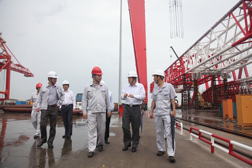 在參觀公司現(xiàn)場(chǎng)建成自用的1600噸龍門吊項(xiàng)目、正在吊裝上船的3600噸全回轉(zhuǎn)浮吊項(xiàng)目、面對(duì)公司的120米突堤碼頭以及繁忙的生產(chǎn)組裝現(xiàn)場(chǎng),董總對(duì)公司的經(jīng)營(yíng)發(fā)展態(tài)勢(shì)予以充分肯定。他說(shuō):在當(dāng)前市場(chǎng)經(jīng)濟(jì)低迷的形勢(shì)下,青島海西重機(jī)能夠抓住發(fā)展機(jī)遇,逆勢(shì)而上,尤其在技術(shù)創(chuàng)新和產(chǎn)品開(kāi)發(fā)方面發(fā)揮了自身潛能,具有前瞻性和市場(chǎng)眼光,更是武漢船機(jī)公司在船市低迷的情況下,產(chǎn)品結(jié)構(gòu)調(diào)整的有力體現(xiàn)。董總特別對(duì)近期在煙臺(tái)、連云港、海南洋浦等港口項(xiàng)目投標(biāo)中,我司與上海振華同臺(tái)競(jìng)標(biāo)并連續(xù)奪得標(biāo)的給予了高度肯定。